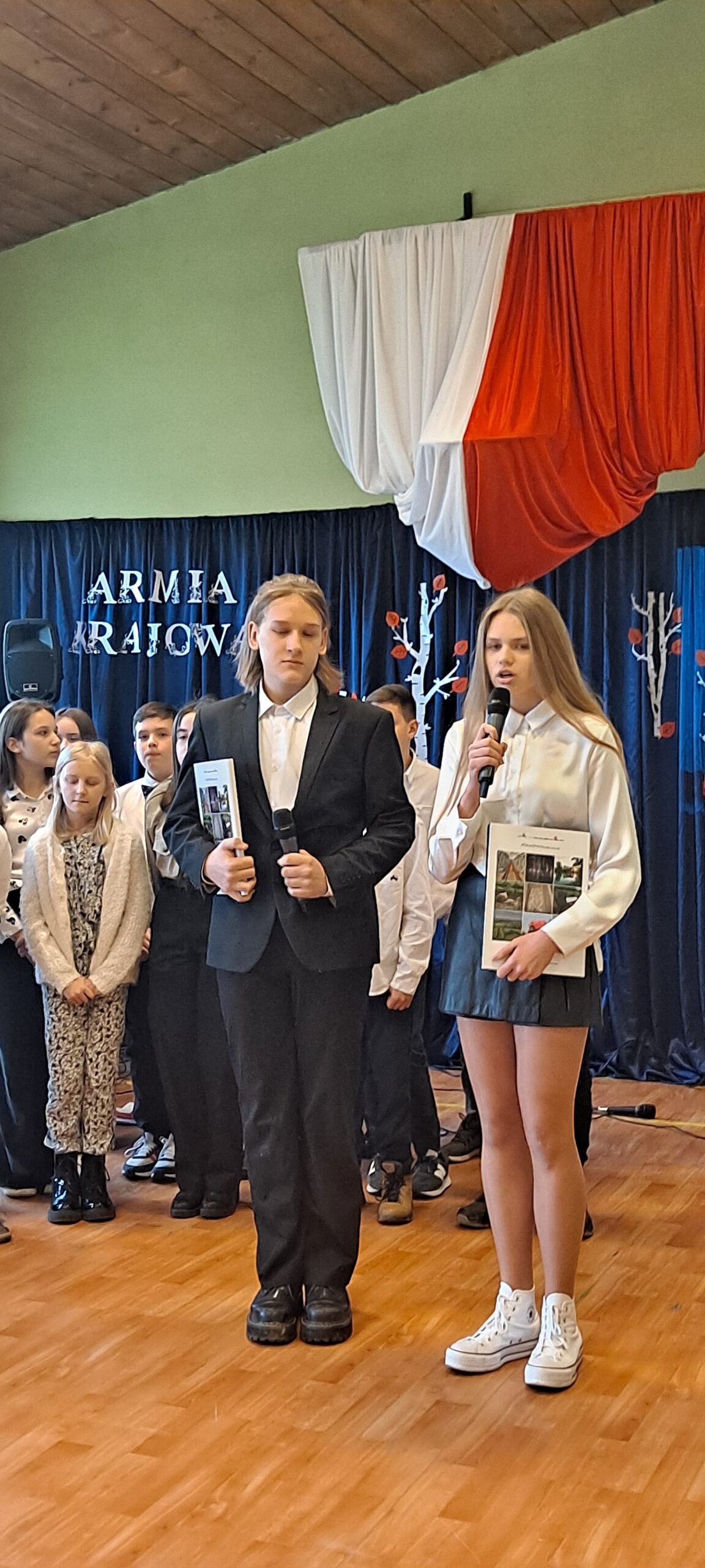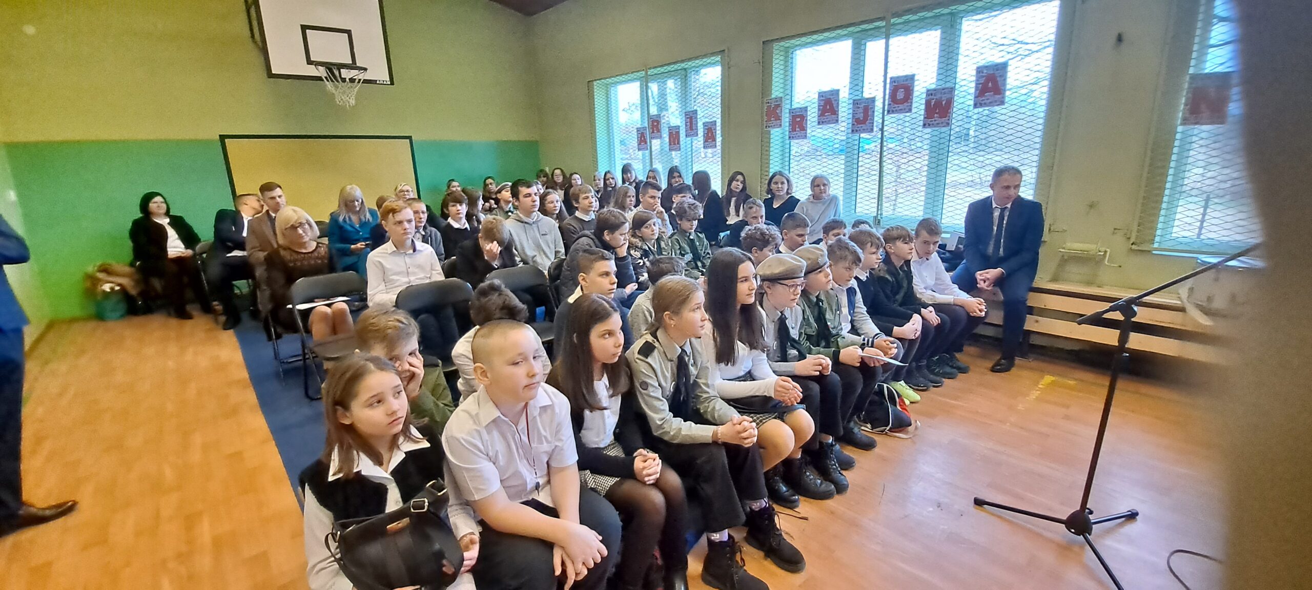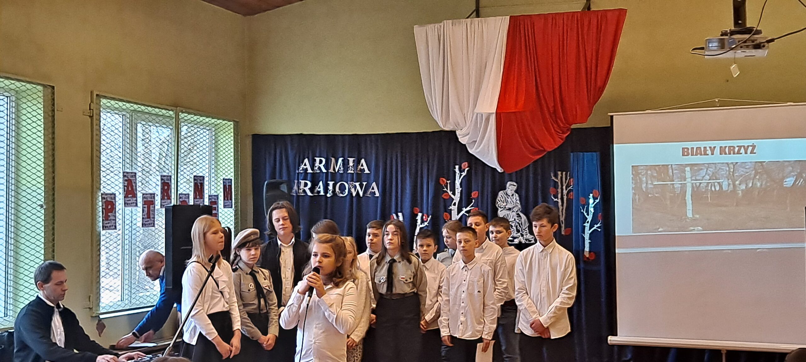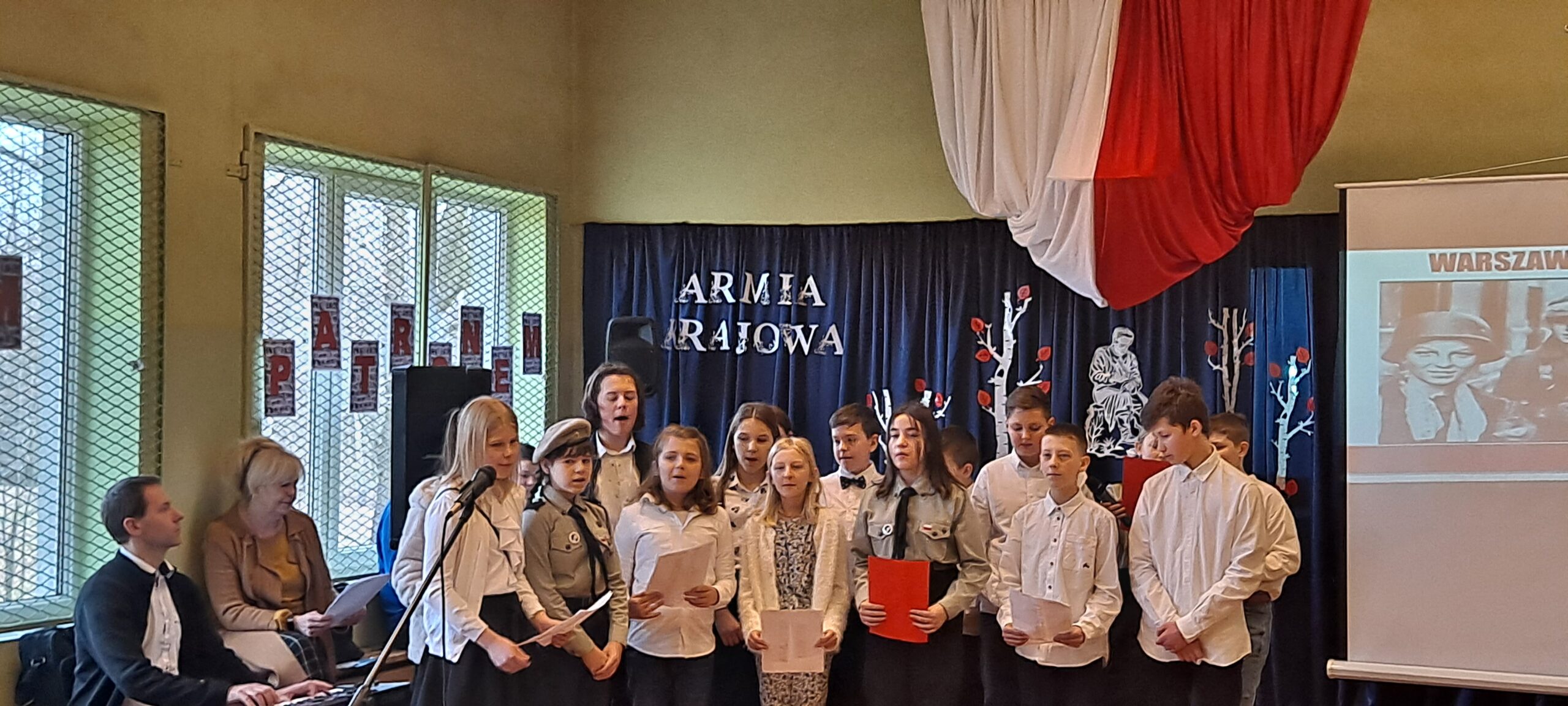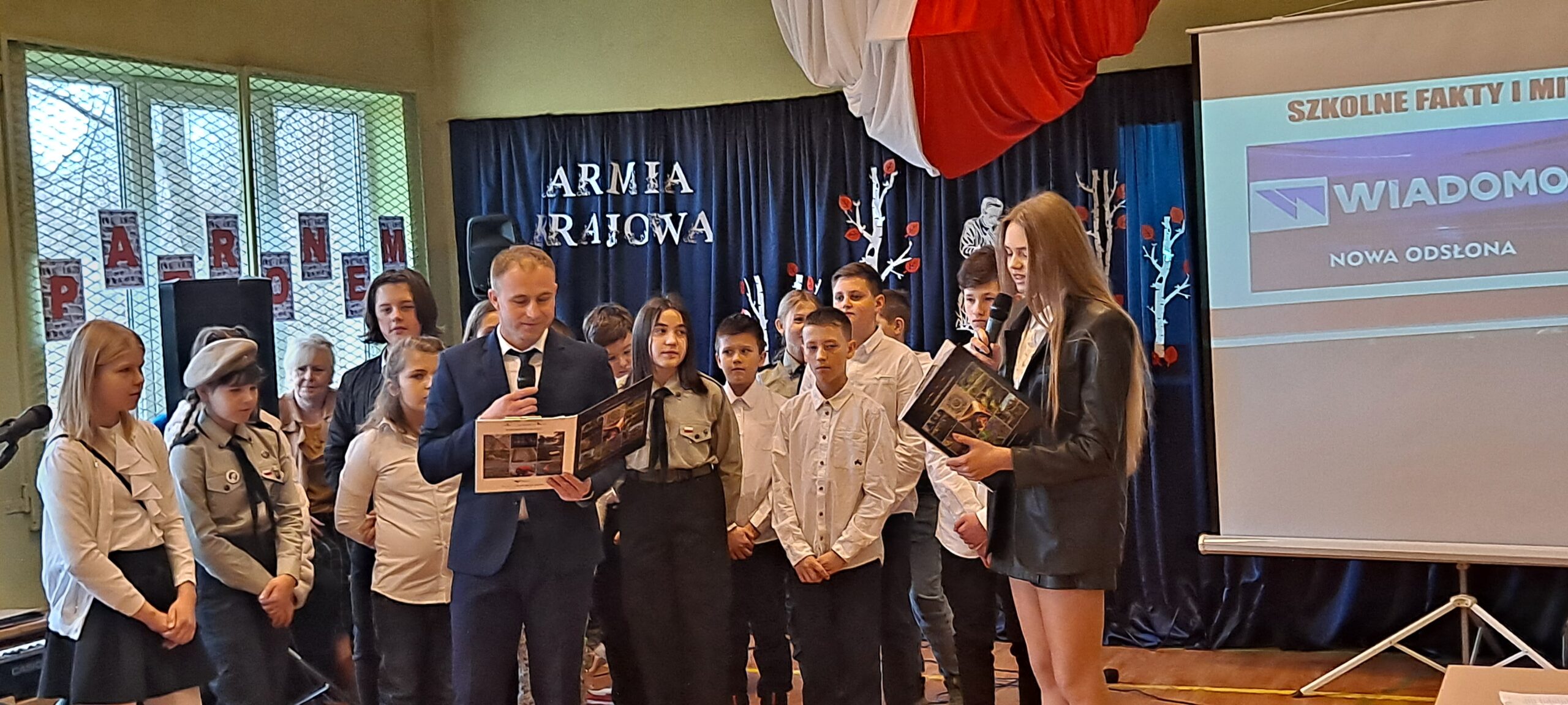 W ten piękny piątkowy dzień od samego rana świętowaliśmy imieniny naszej szkoły. Z tej okazji jak co roku przypomnieliśmy wszystkim postać naszego Patrona, Armii Krajowej. Wspominaliśmy, kim byli jej członkowie, co dla nas Polaków zrobili i dlaczego to właśnie Armia Krajowa została wybrana na naszego patrona. Na ten wyjątkowy dzień uczniowie klasy piątej i szóstej przygotowali wspaniałe przedstawienie. Pierwsza jego część nosząca tytuł „Pamięci ich będziemy godni” poświęcona była naszemu Patronowi, natomiast w części drugiej młodzi aktorzy starali się odpowiedzieć na pytanie, czym dla nas jest szkoła? Było poważnie i dostojnie a także wesoło i radośnie. Podczas trwania akademii poświęconej Armii Krajowej uczniowie zachowali powagę i spokój, gdy zaś rozpoczęła się część poświęcona współczesnej szkole i zabawnym perypetiom jej uczniów, co chwilę wybuchały chichoty i na twarzach widzów widać było radosne uśmiechy.