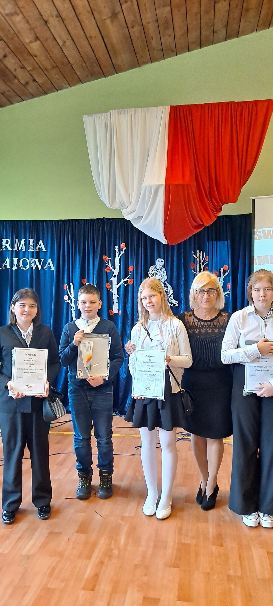 Na zakończenie świątecznego dnia ogłoszono wyniki konkursu plastycznego „Nasza szkoła”. Wszystkim wyróżnionym wręczono nagrody ufundowane przez Radę Rodziców oraz Panią Małgorzatę Adamus.